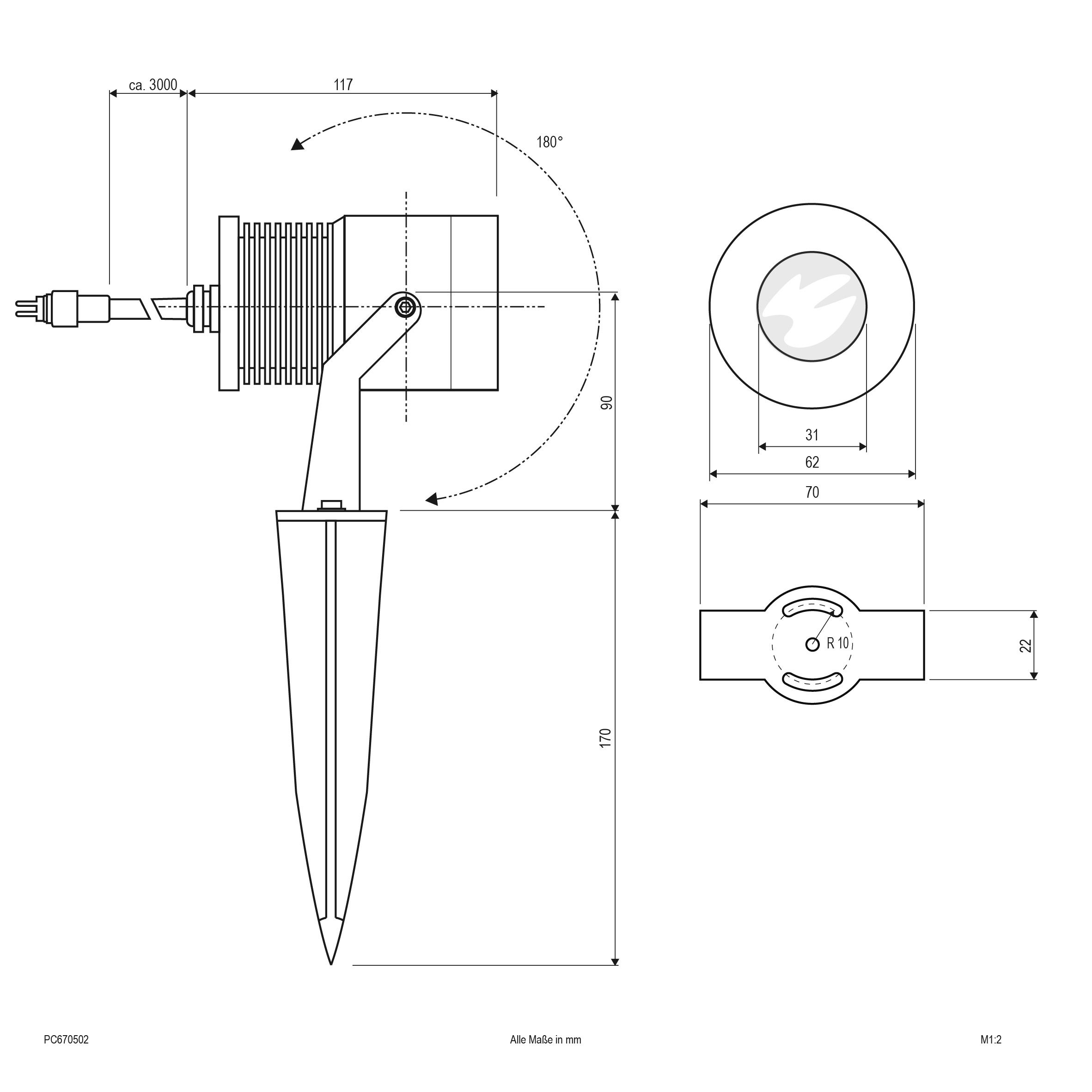 Reflektor ogrodowy LED z kolcem uziemiającym i przewodem przyłączeniowym do systemu wtykowego IP44 24VGłowica reflektora ogrodowego LED z aluminium może być obracana o 90° (z zamontowanym kolcem uziemiającym), a także odchylana o 45°. Do reflektora dołączony jest 3-metrowy kabel przyłączeniowy z wtyczką do systemu wtykowego IP44. Wejście kabla do oprawy odbywa się poprzez dławik kablowy. Dzięki przygotowaniu do systemu wtykowego IP44 można bez problemu instalować również większe systemy.- Wyposażona w uchwyt (może być również stosowana bez kolca uziemiającego)- Kąt wiązki: 21° do 40°- Odpowiedni zasilacz do systemu wtykowego należy zamówić osobno (akcesoria)