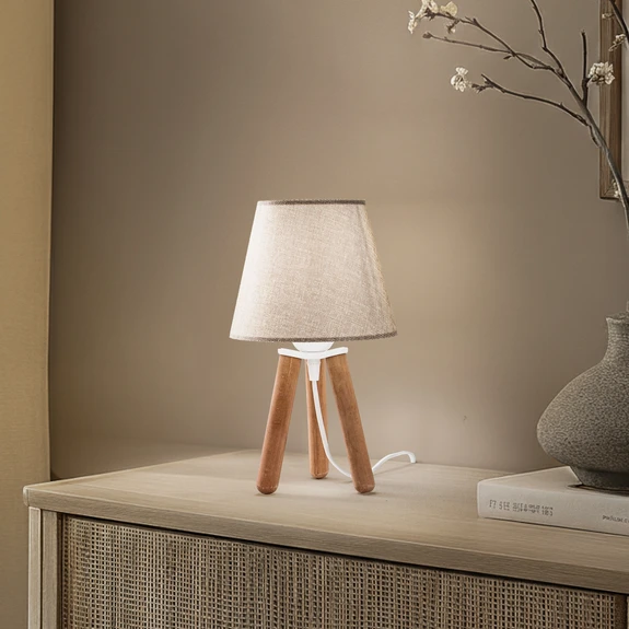 Lampa stołowa Dona, beżowa/kolor drewna, tkanina, drewno, trójnóg