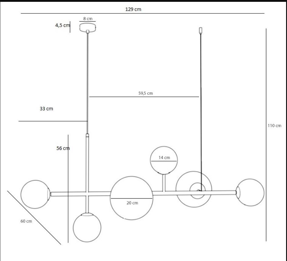 - Ø większego klosza 20 cm; Ø mniejszego klosza 14 cm; Ø rozety sufitowej 8 cm; odległość zawieszenia pierwotnego do wtórnego 59,5 cm