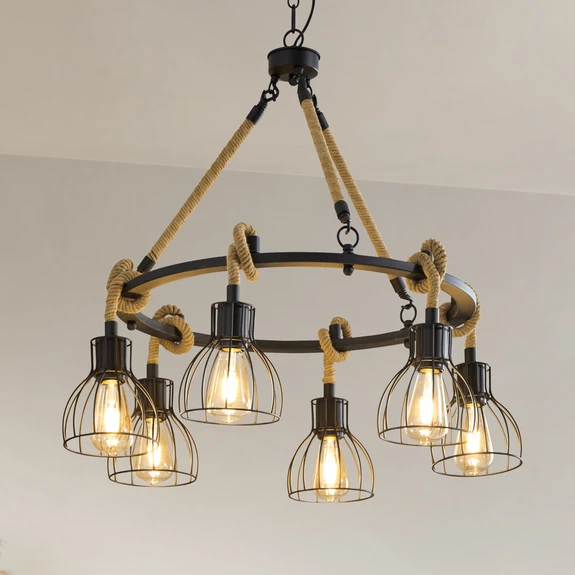 Sześć czarnych klatkowych kloszy ze stali jest zawiązanych na czarnym stalowym pierścieniu na linie. Rusztowanie utrzymywane jest przez trzy grube liny, wszystkie wsparte na hakach. Dzięki temu lampa uzyskuje dynamikę zawieszenia.