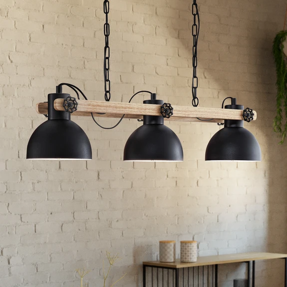 Żyrandol Lubenham łączy w sobie stylowy design z praktycznym zastosowaniem. Połączenie czarnego metalu i jasnego drewna idealnie komponuje się z różnymi koncepcjami aranżacji wnętrz i tworzy atmosferę, która może być zarówno przytulna, jak i inspirująca. Umieszczona nad stołem jadalnym lub jako centralny element wystroju salonu lub kuchni, ta 3-punktowa lampa zapewnia zrównoważone oświetlenie, które wypełnia pomieszczenie przyjemnym światłem.