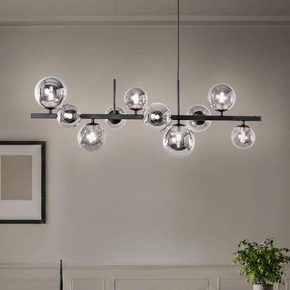 Żyrandol Rumba łączy w sobie nowoczesny design z eleganckim połączeniem szkła i metalu. Połączenie czarnego i dymnoszarego wykończenia nadaje lampie ponadczasową elegancję, która idealnie komponuje się z różnymi stylami wnętrz. Dzięki dziesięciu źródłom światła zapewnia równomierne i przyjemne oświetlenie, idealne do salonów i jadalni.